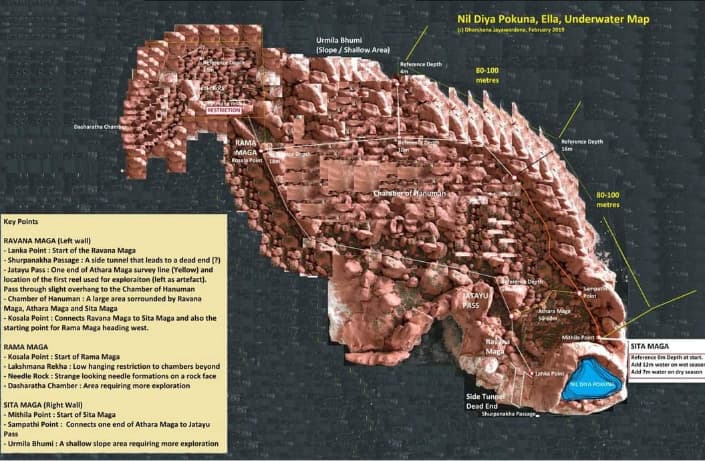The first person to dive into the cave was Dharshan Jayewardene. He created a map of the underwater part of the cave from 2017-2021. Dharshana states that it’s an amazing place and so far the only underwater cave system in Sri Lanka. That “underwater it is a massive space spanning hundreds of square meters and at its deepest point, 30m (100ft) deep, and during rainy season when the water levels rise the water temperature is 23C. There is no visible living beings in the water.”